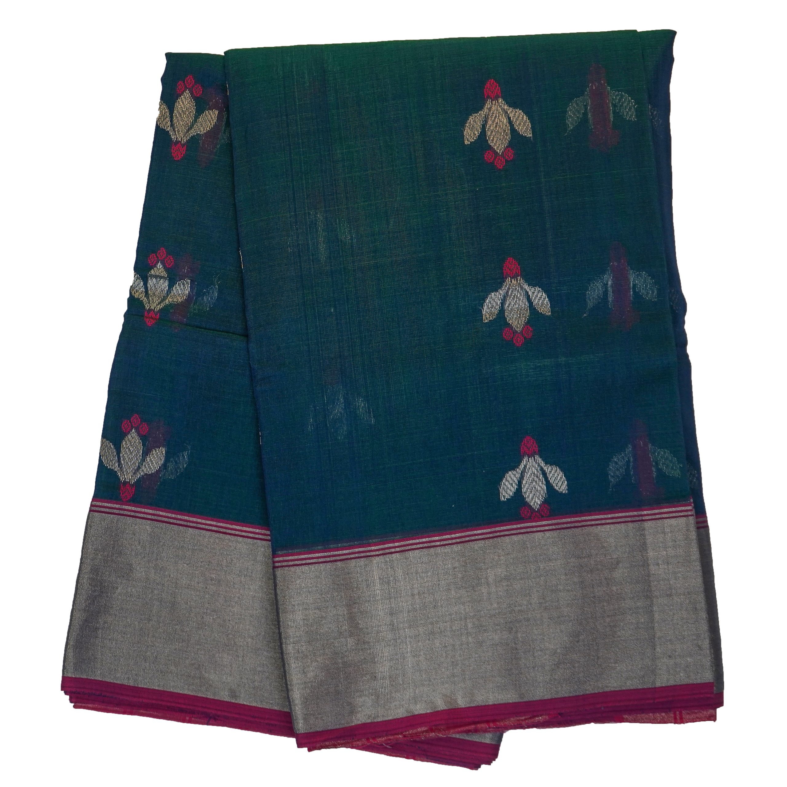 Dual toned bluish green Handloom saree with silver and pink flower butta all over body ,A silver zari border and Pallu with running blouse.