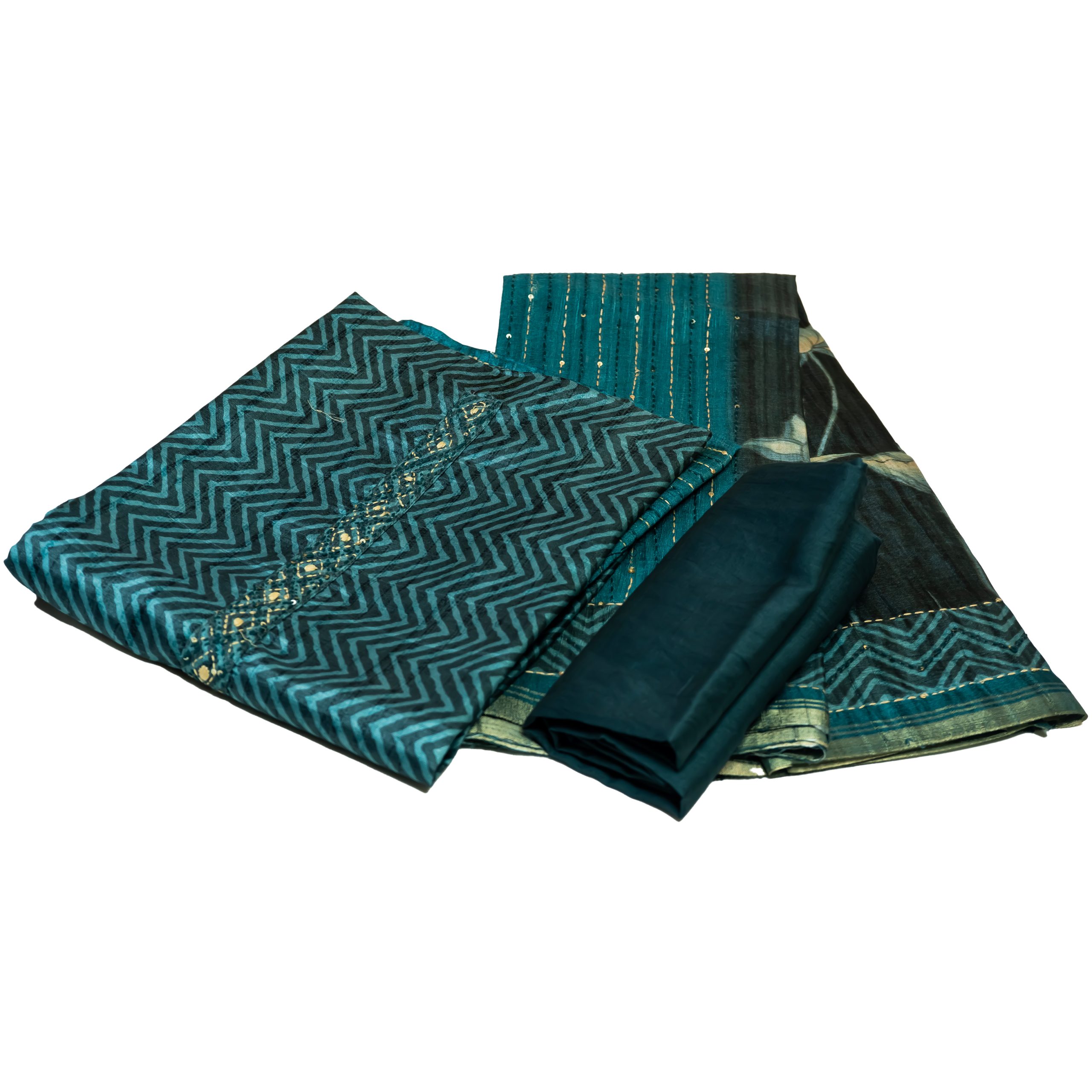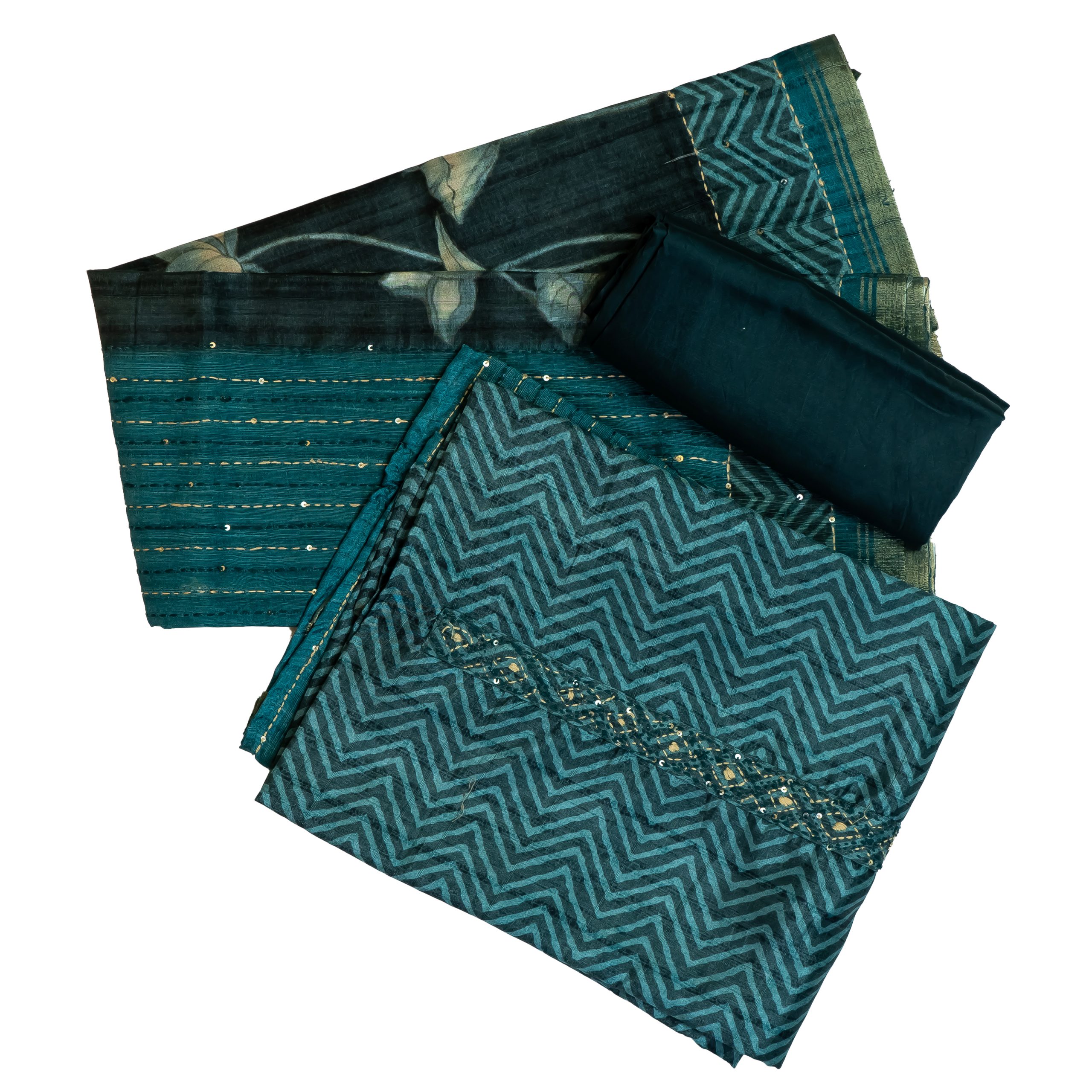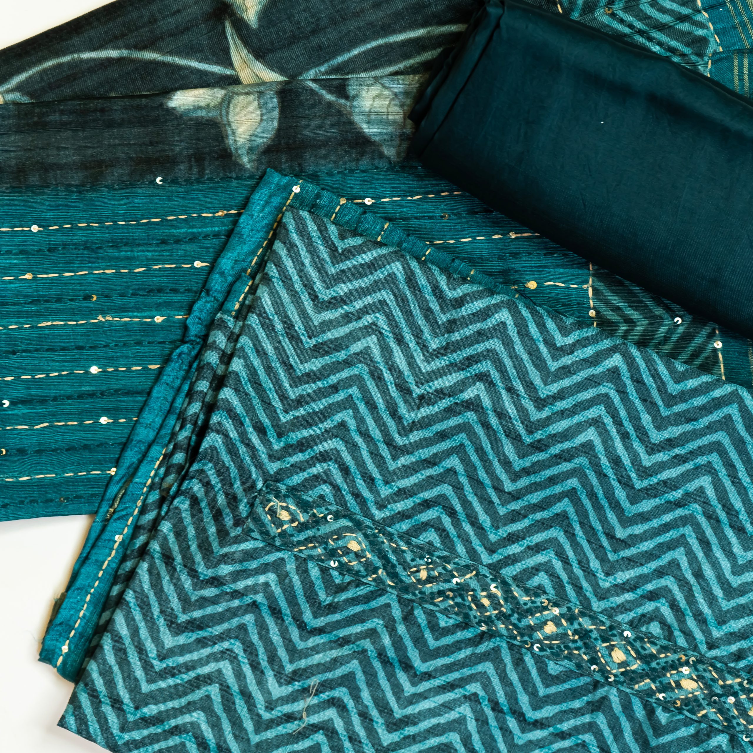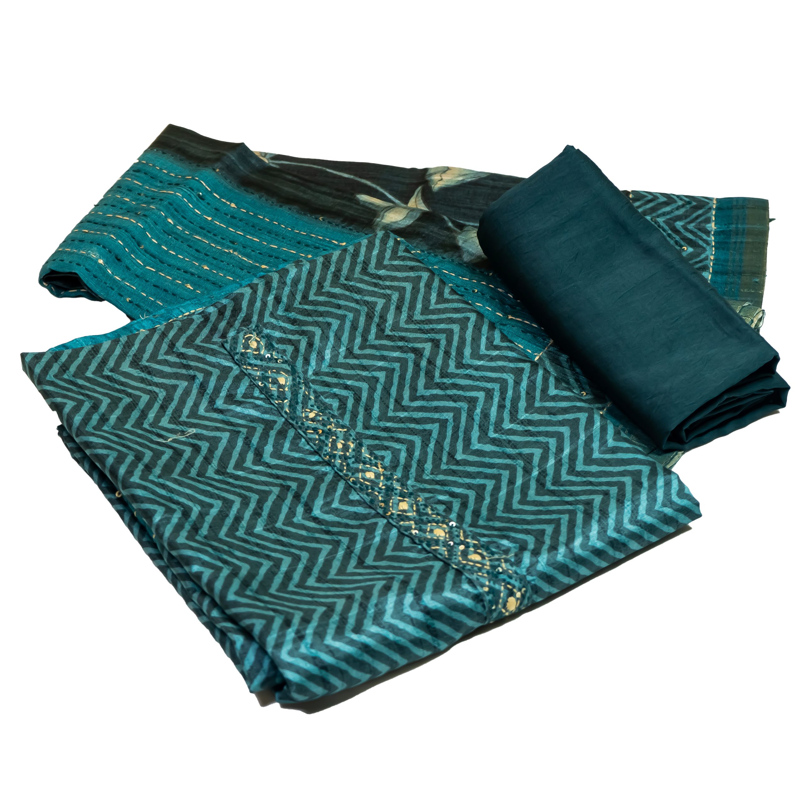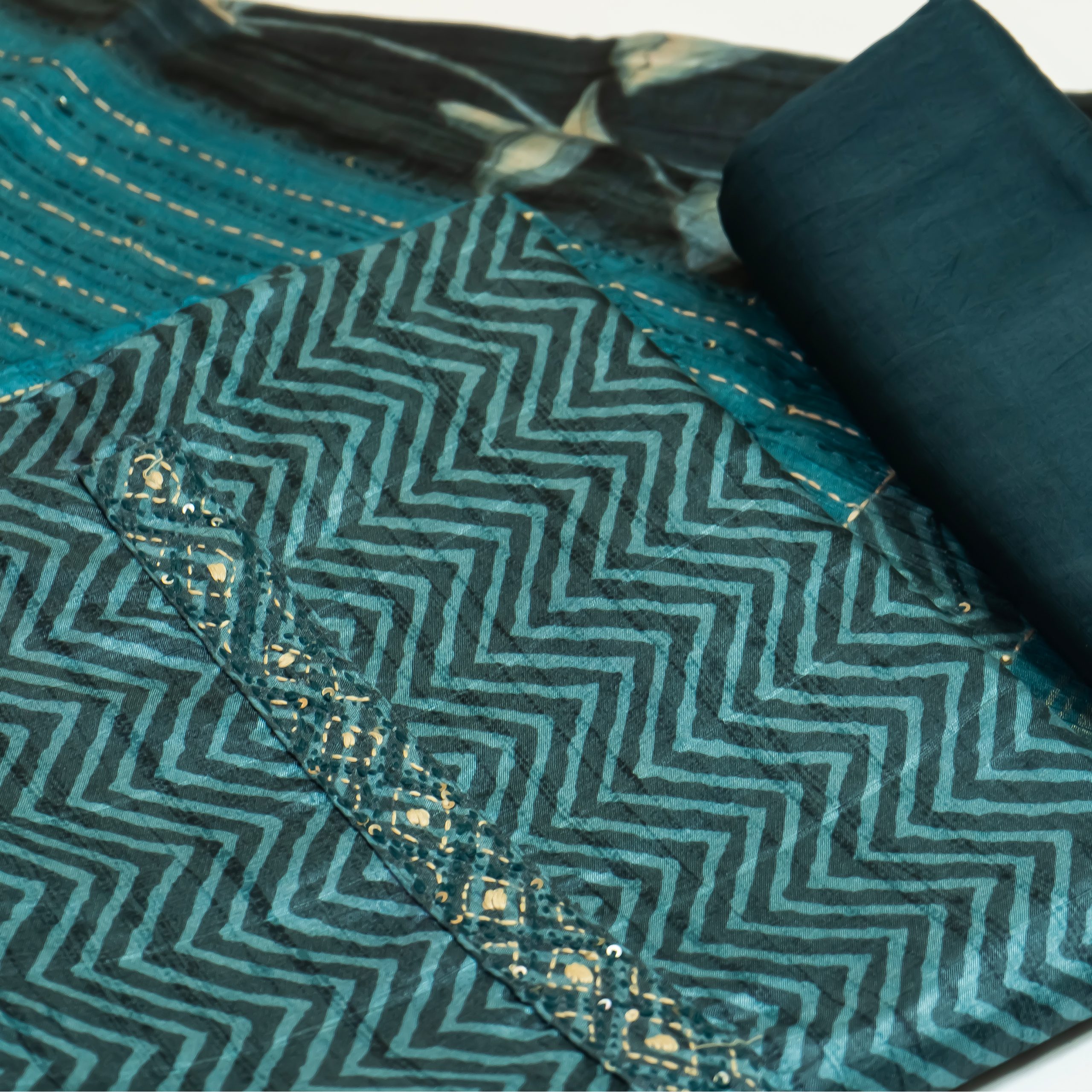 an oustanding combination of turqoise and teal green zigzag pattern on Top , Kantha stitch detailing on Neck and Daman. Teal green solid colour bottom . Semi silk Dupatta with digital print and Kantha stitch .Perfect for Formal wear.